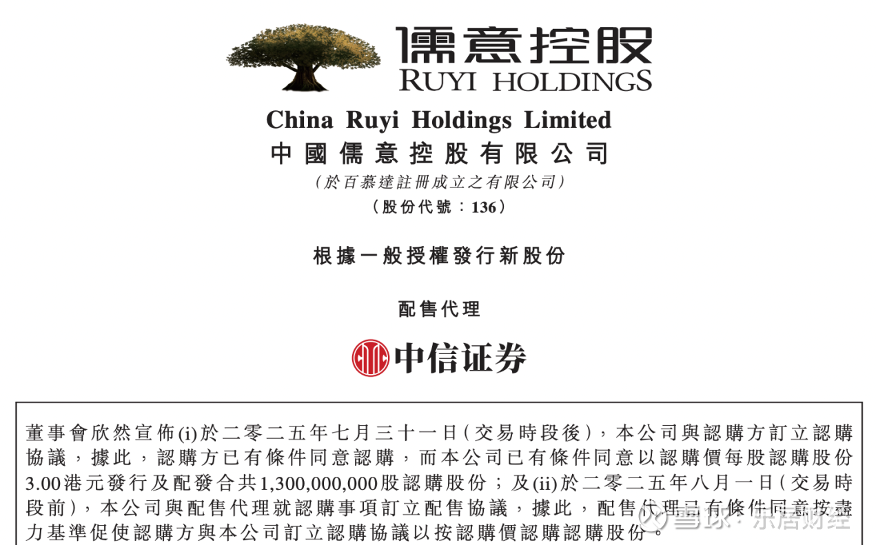 中国儒意7月31日与认购方(无极资本管理有限公司)订立认购协议,以认购价每股认购股份3港元发行及配发合共13亿股认购股份;2025年8月1日(交易时段前),公司与配售代理就认购事项订立配售协议,据此,配售代理按尽力基准促使认购方与公司订立认购协议以按认购价认购认购股份。