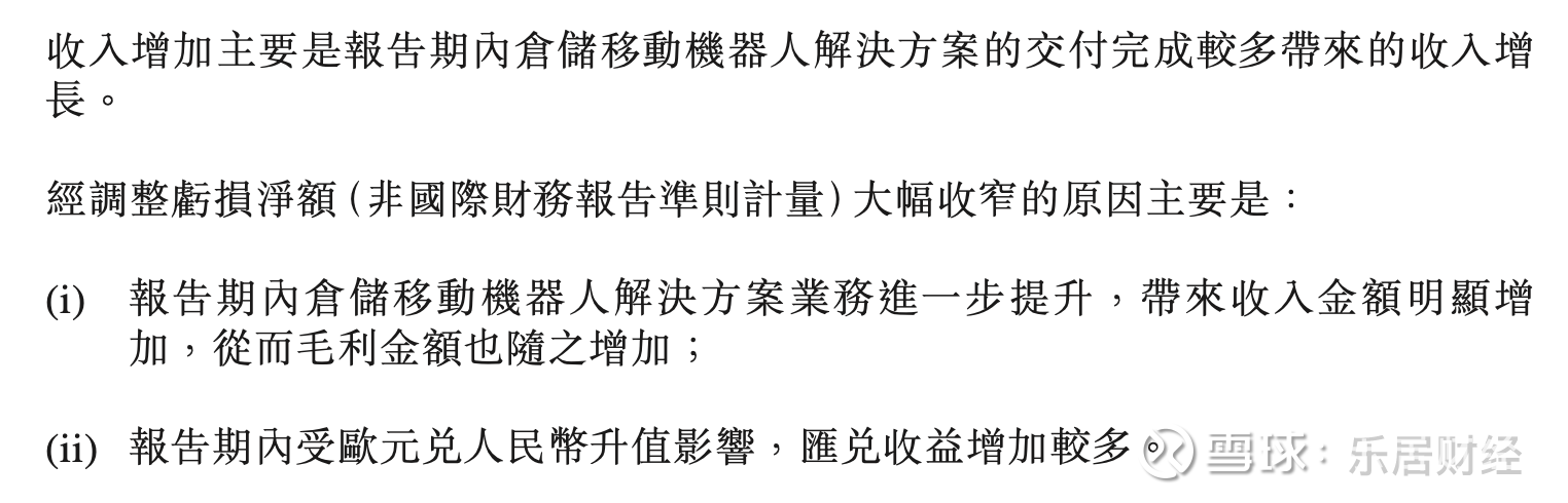而经调整亏损净额(非国际财务报告准则计量)大幅收窄的原因主要是报告期内仓储移动机器人解决方案业务进一步提升,带来收入金额明显增加,从而毛利金额也随之增加;报告期内受欧元兑人民币升值影响,汇兑收益增加较多。