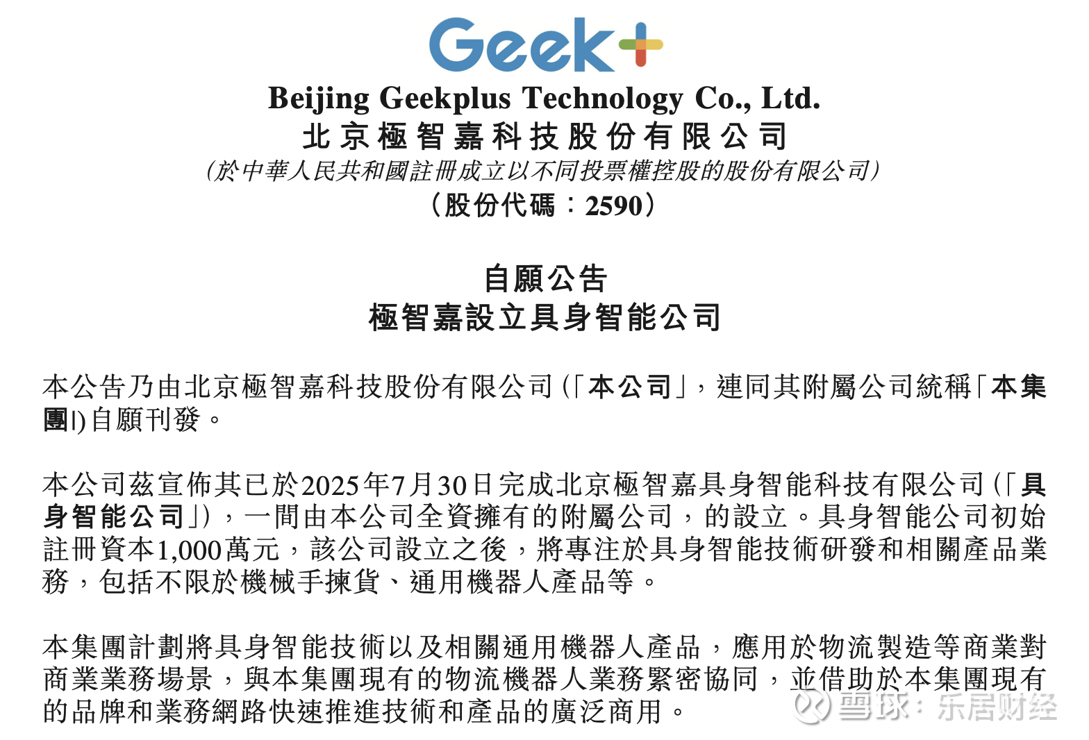 该子公司初始注册资本1000万元,设立之后,将专注于具身智能技术研发和相关产品业务,包括不限于机械手拣货、通用机器人产品等。集团计划将具身智能技术以及相关通用机器人产品,应用于物流制造等商业对商业业务场景,与集团现有的物流机器人业务紧密协同,并借助于集团现有的品牌和业务网路快速推进技术和产品的广泛商用。