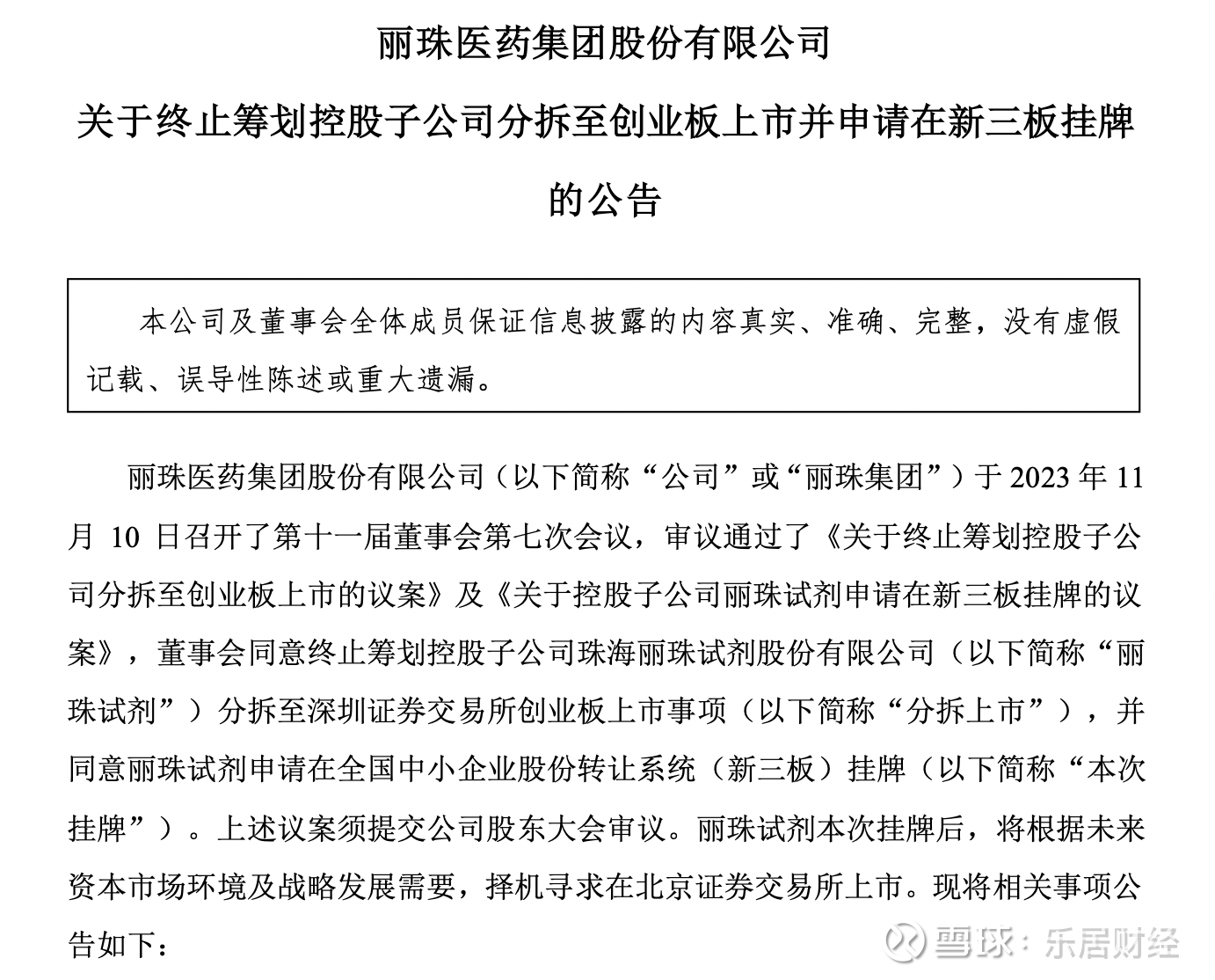 早在2023年11月,丽珠集团发布公告称,综合考虑资本市场环境变化、公司自身经营情况及未来业务战略定位,统筹安排业务发展和资本运作规划,经充分沟通与论证,公司决定终止控股子公司丽珠试剂分拆至深圳证券交易所创业板上市事项。