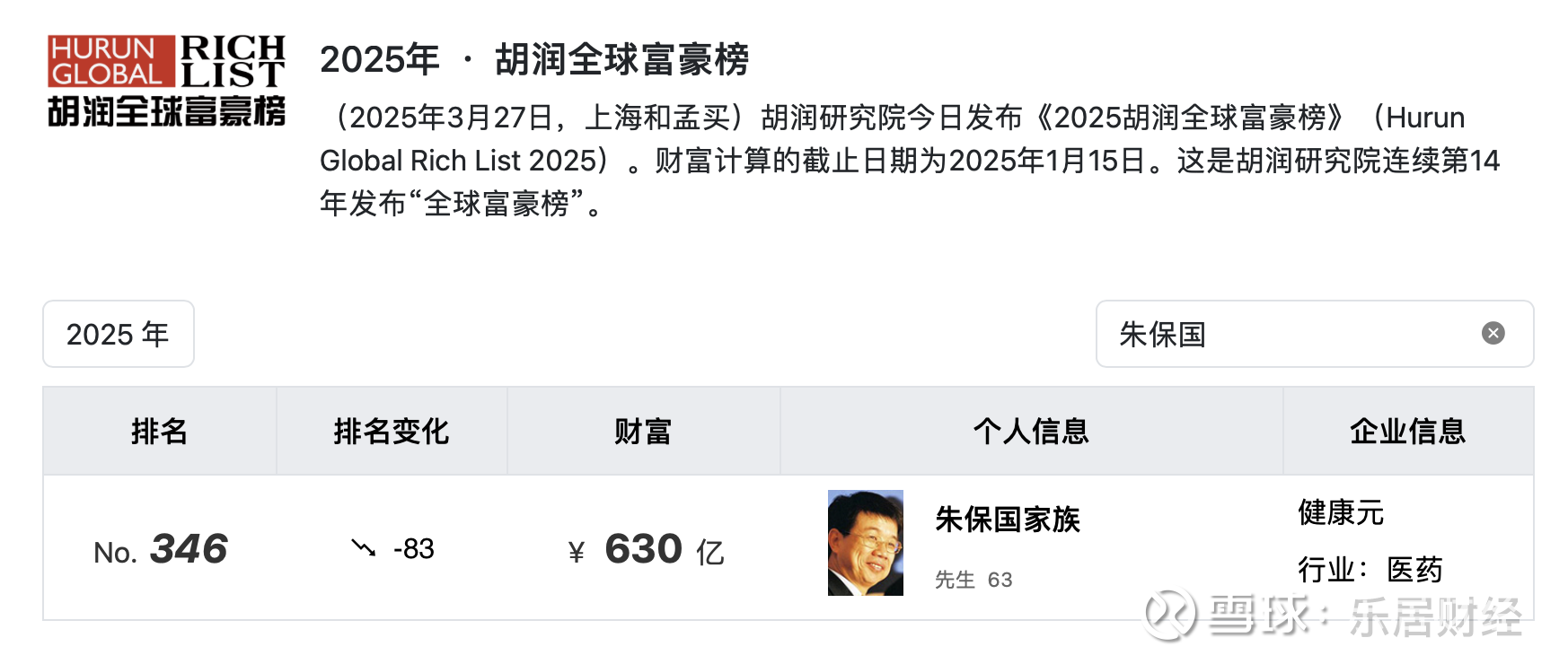 提起朱保国,就不得不说起他曾于1992年创立的深圳爱迷尔食品有限公司。该公司旗下有广为人知的明星保健品——“太太口服液”。据《2025年胡润全球富豪榜》,朱保国以630亿元财富位列榜单第346位。