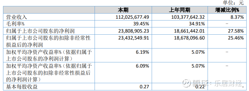 报告显示,惠同新材公司上半年营业收入为1.12亿元,同比增长8.37%;归母净利润为2380.89万元,同比增长27.58%;扣非归母净利润为2343.25万元,同比增长25.45%;基本每股收益0.27元。
