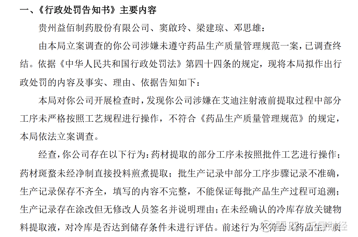 2024年4月,益佰制药公告,近日,公司法定代表人窦啟玲、生产负责人梁建琼及质量负责人兼质量受权人邓思雄分别收到贵州省药品监督管理局出具的《行政处罚告知书》。