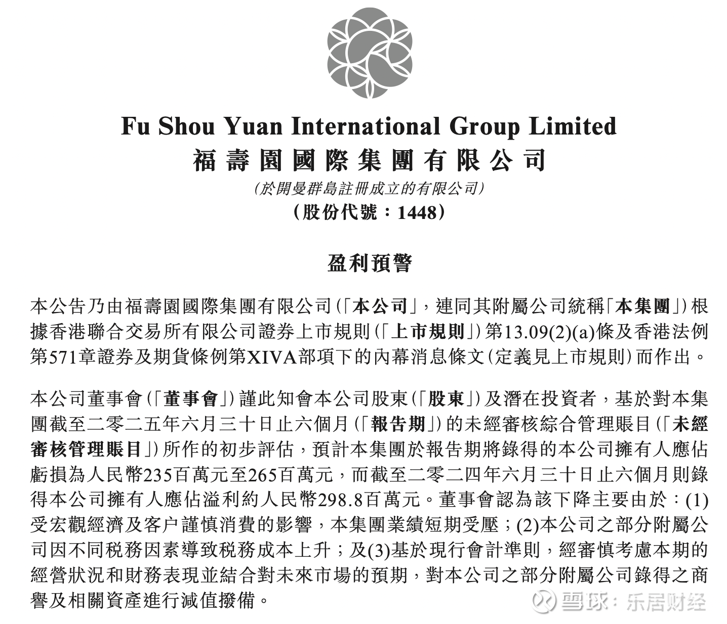董事会认为该下降主要归因为三点:受宏观经济及客户谨慎消费的影响,集团业绩短期受压;公司之部分附属公司因不同税务因素导致税务成本上升;及基于现行会计准则,经审慎考虑本期的经营状况和财务表现并结合对未来市场的预期,对公司之部分附属公司录得之商誉及相关资产进行减值拨备。