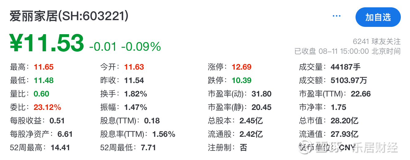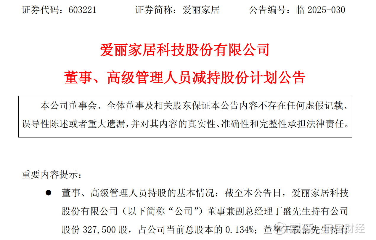 爱丽家居强调,本次减持主体均不属于公司控股股东、实际控制人及一致行动人,且减持数量均未超过各自持股总数的25%。截止2025年8月11日收盘,爱丽家居收报11.53元/股,按此计算减持数额约300万元。