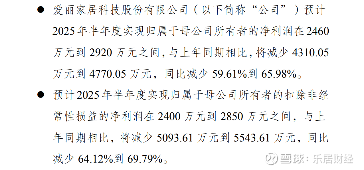 最新数据显示,爱丽家居预计2025年半年度实现归属于母公司所有者的净利润在2460万元到2920万元之间,与上年同期相比,将减少4310.05万元到 4770.05 万元,同比减少59.61%到65.98%。