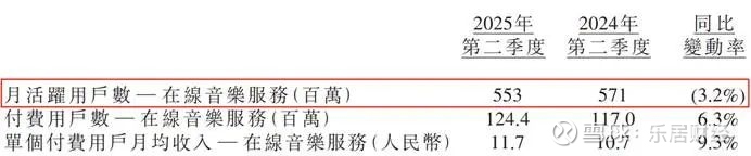 其中,在线音乐订阅收入为43.8亿元,同比增长17.1%。这一显著增长主要由单个付费用户月均收入的提升所推动。2025年二季度,其单个付费用户月均收入为11.7元。