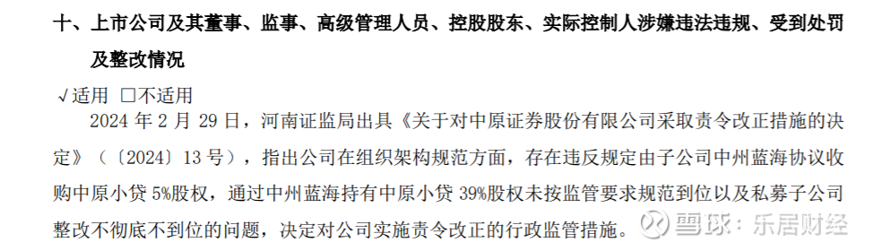 值得注意的是,2024年2月29日,河南证监局出具《关于对中原证券股份有限公司采取责令改正措施的决定》(〔2024〕13号),指出公司在组织架构规范方面,存在违反规定由子公司中州蓝海协议收购中原小贷5%股权,通过中州蓝海持有中原小贷39%股权未按监管要求规范到位以及私募子公司整改不彻底不到位的问题,决定对公司实施责令改正的行政监管措施。