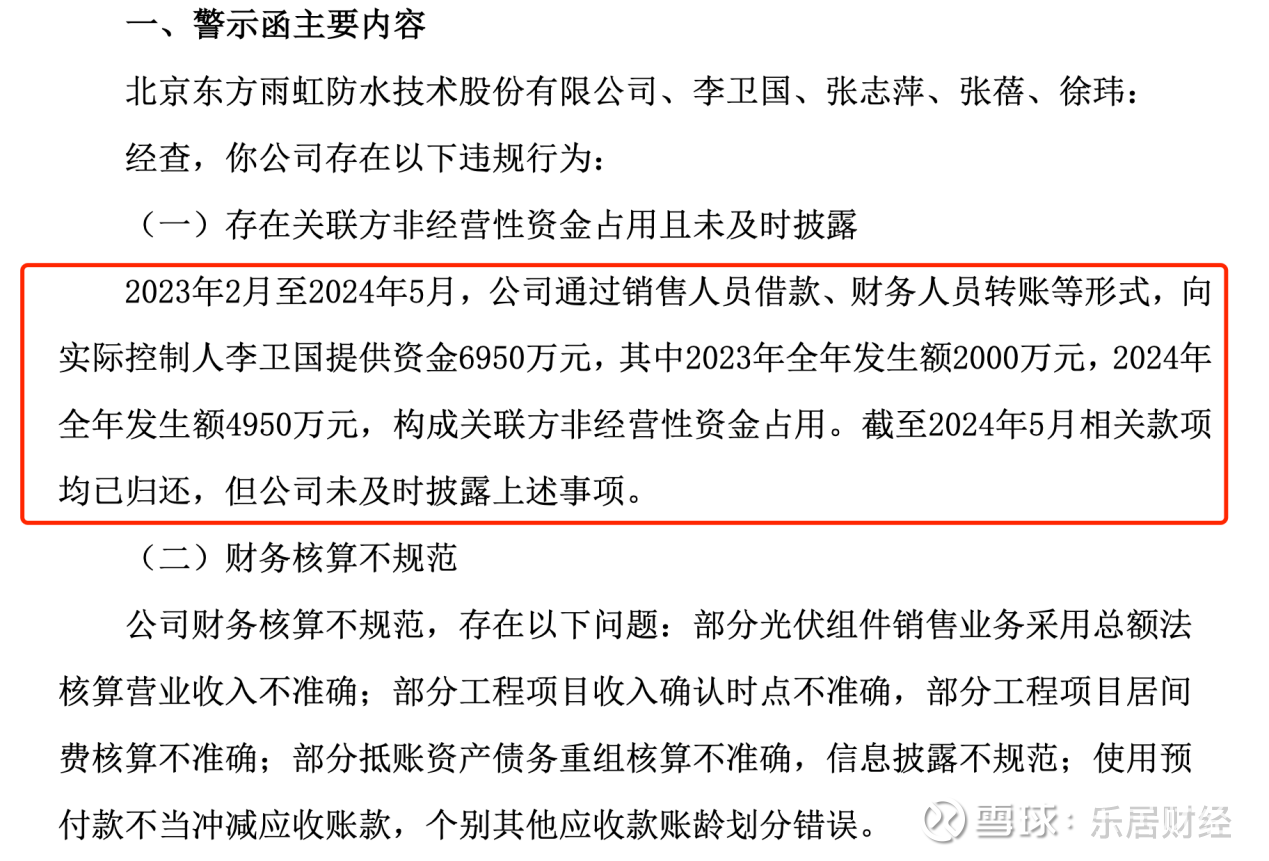 据警示函披露,2023年2月至2024年5月,东方雨虹通过销售人员借款、财务人员转账等形式,向实际控制人李卫国提供资金6950万元,其中2023年全年发生额2000万元,2024年全年发生额4950万元,构成关联方非经营性资金占用。截至2024年5月相关款项均已归还,但东方雨虹未及时披露上述事项。