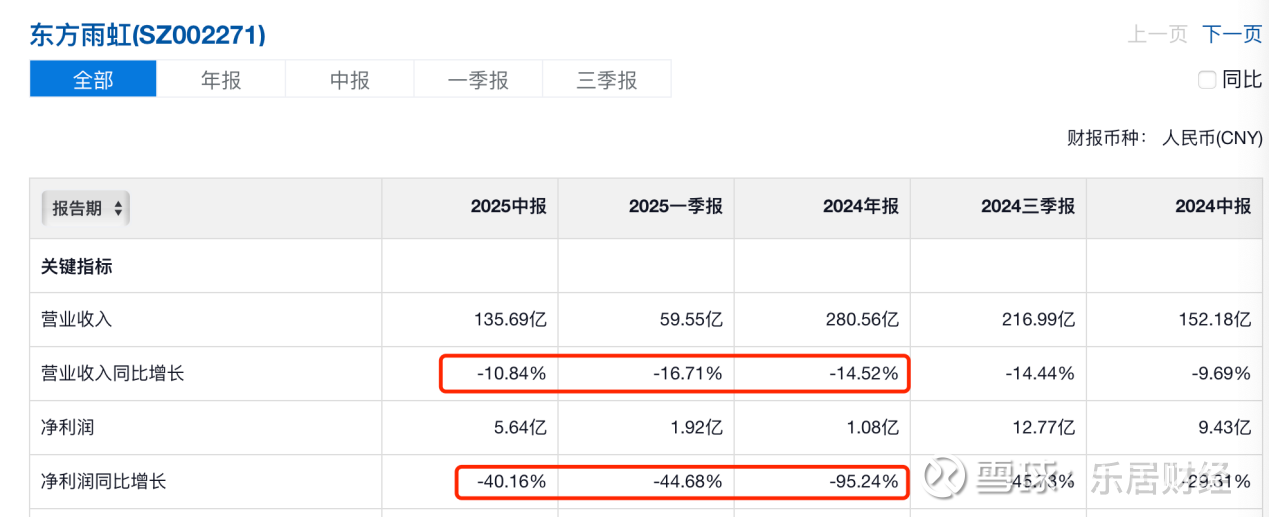 而另一方面,东方雨虹在债务压力之下,其高额分红则更令人意外。财报显示,2024年,东方雨虹实现营业收入280.56亿元,同比下滑14.52%;归母净利润则骤降至1.08亿元,同比降幅高达95.24%。进入2025年,其上半年营业总收入135.69亿元,同比下降10.84%;净利润5.64亿元,同比减少40.16%。