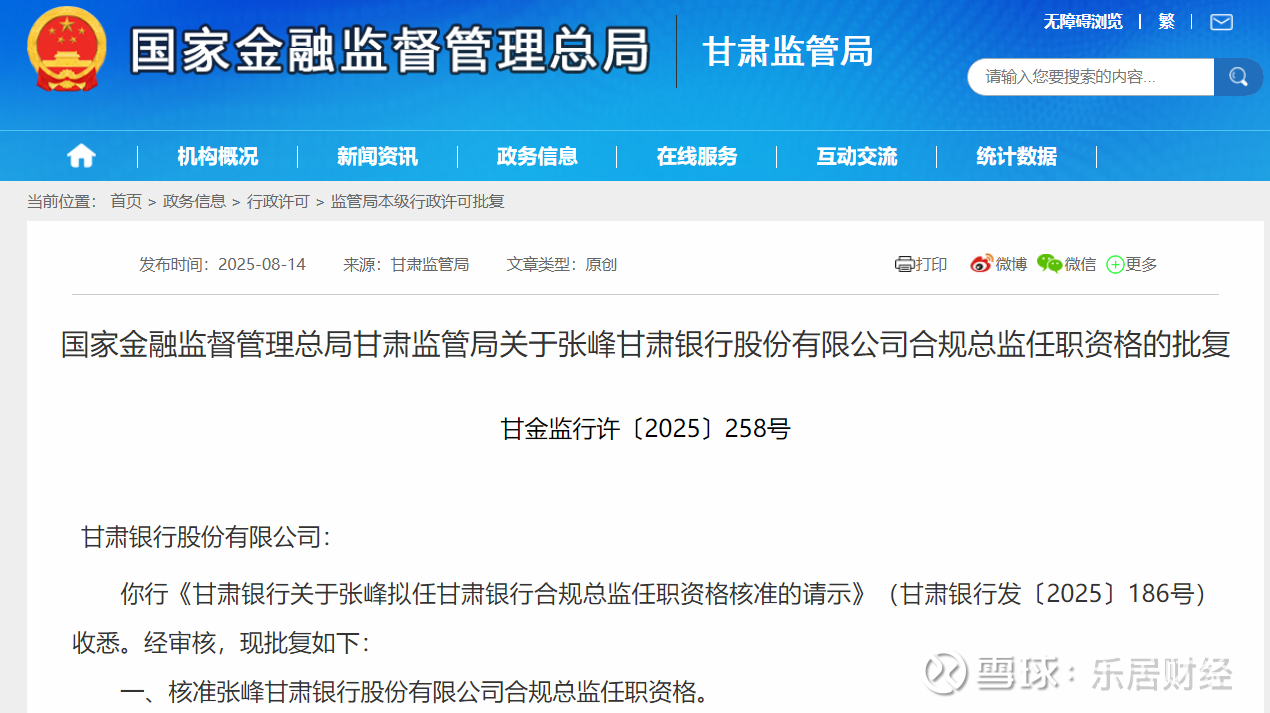 瑞财经 王敏8月14日,国家金融监督管理总局甘肃监管局发布关于张峰甘肃银行股份有限公司(以下简称“甘肃银行”)合规总监任职资格的批复,核准张峰该行合规总监任职资格。