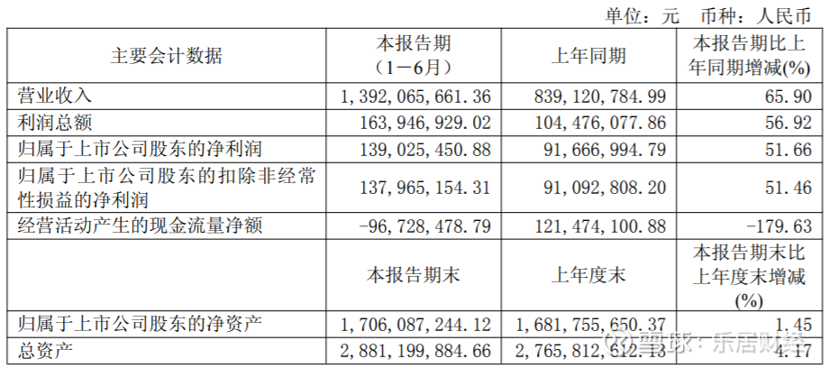 2025年上半年,公司实现营业收入13.92亿元,同比增长65.90%;实现归属于上市公司股东的净利润1.39亿元,同比增长51.66%。
