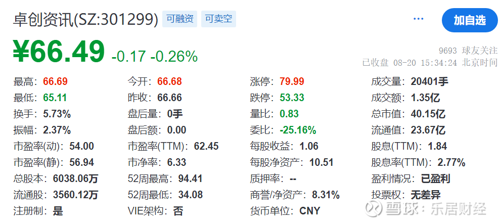 据悉,卓创资讯于2022年10月19日,正式登陆深交所创业板,截至8月20日收盘,其报66.49元,总市值40亿元。