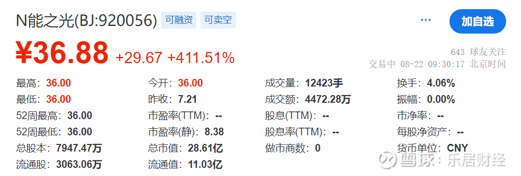 乐居财经 王敏8月22日,N能之光(BJ:920056)在北交所挂牌上市,保荐机构为国金证券,开盘涨411.5%,总市值28.6亿元。
