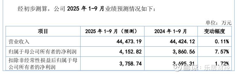 公司2025年1-9月预计实现营业收入4.45亿元,预计增长幅度为0.11%;预计实现扣除非经常性损益后的归属于母公司所有者的净利润为3758.74万元,预计增长幅度为1.72%。