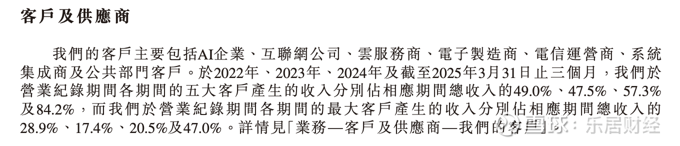2022年-2025年第一季度,前五大客户分别为云天励飞贡献了49.0%、47.5%、57.3%及84.2%的收入,最大客户为其贡献了28.9%、17.4%、20.5%及47.0%的收入。