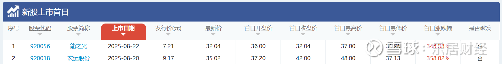 回顾上周(8月18日-8月22日),A股迎来了2只“新成员”。在首日表现中,宏远股份登陆北交所,其大涨358%;能之光登陆北交所,其大涨344.38%。