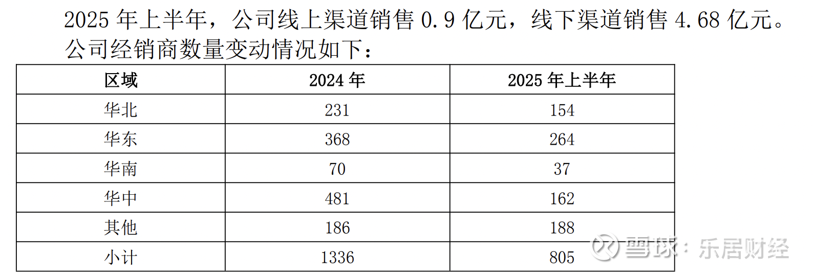 酒鬼酒产品主要采用经销模式。销售渠道主要有线上渠道和线下渠道两种销售方式。2025年上半年,公司线上渠道销售0.9亿元,线下渠道销售4.68亿元。此外,2025 年上半年,公司经销商数量为805个,较2024年1336个净减少531个。
