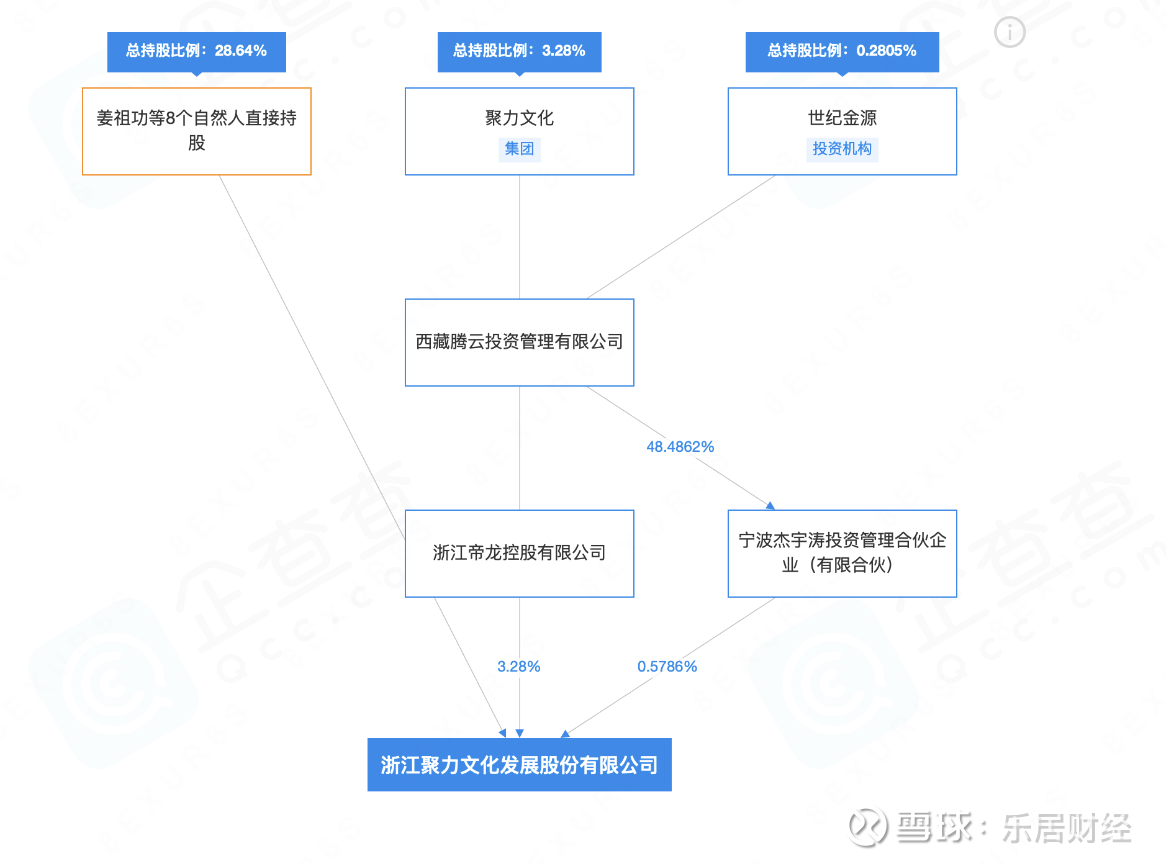 在公司发展历程中,聚力文化的股权结构也经历了复杂的变动。2017年12月,帝龙文化(彼时聚力文化尚未更名)第一大股东帝龙控股及股东姜祖功与揽众天道签订协议,将持有的合计8000万股无限售流通股作价13.75元/股转让给宁波揽众天道,作价11亿元。