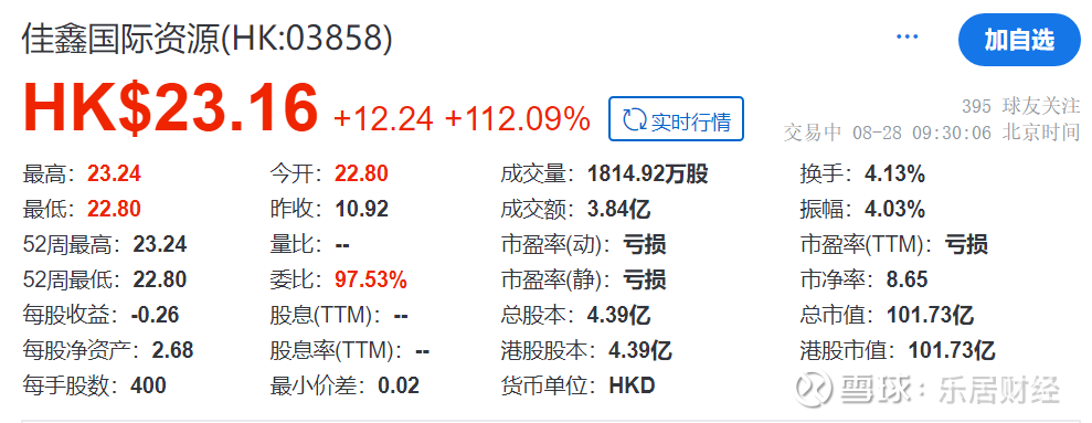 乐居财经 王敏8月28日,佳鑫国际资源(HK:03858)在港交所挂牌上市,中金公司为独家保荐人,其开盘涨112%,总市值101.73亿港元。