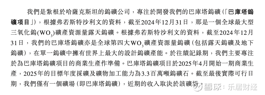 佳鑫国际资源是扎根于哈萨克斯坦的钨矿公司,专注于开发巴库塔钨矿(巴库塔钨矿项目),根据弗若斯特沙利文的资料,截至2024年12月31日,那是一个全球最大型三氧化钨(WO3)矿产资源量露天钨矿。