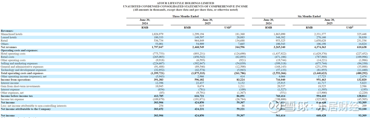 2025年第二季度,亚朵集团营收为24.69亿元,同比增长37.4%;归属于股东的净利润为4.24亿元,同比增长39.5%。