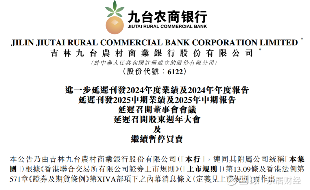 同时,由于继续延迟披露2024年年度报告,为保证数据的连续性,九台农商银行将会延迟披露2025中期业绩。