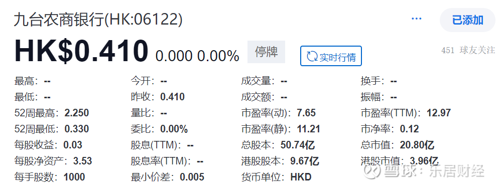 值得注意的是,自从今年3月12日上午9时起,九台农商银行在香港联交所停止交易,至今已停牌五个月。该行停牌前最后一个交易日收市价为0.41港元/股,总市值20.80亿港元。