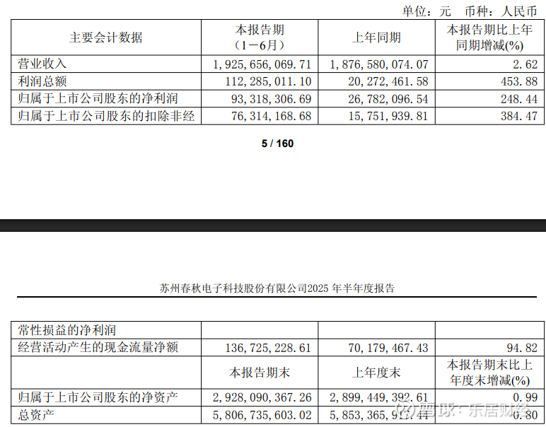 报告显示,春秋电子公司上半年营业收入为19.26亿元,同比增长2.62%;归母净利润为9331.83万元,同比增长248.44%;扣非归母净利润为7631.42万元,同比增长384.47%;基本每股收益0.21元。