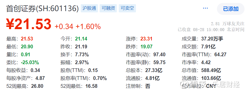 首创证券成立于2000年,是一家北京市国资委实际控制的券商,于2022年12月22日登陆上交所,上市首日股价即大涨43.99%,总市值达278亿元。截至2025年8月28日收盘,其市值已升至588亿元,上市不到三年,市值与股价双双实现翻倍。