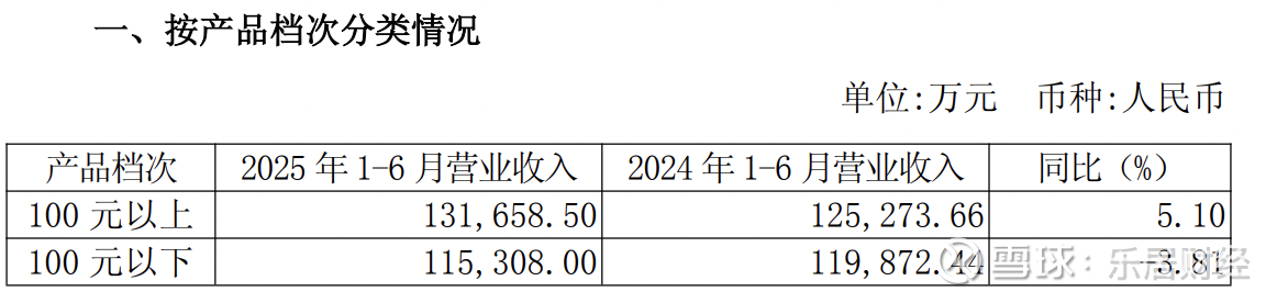 按产品档次分类,2025年上半年,老白干酒100元以上产品营收为13.17亿元,同比增长5.1%;100元以下产品营收为11.53亿元,同比减少3.81%。