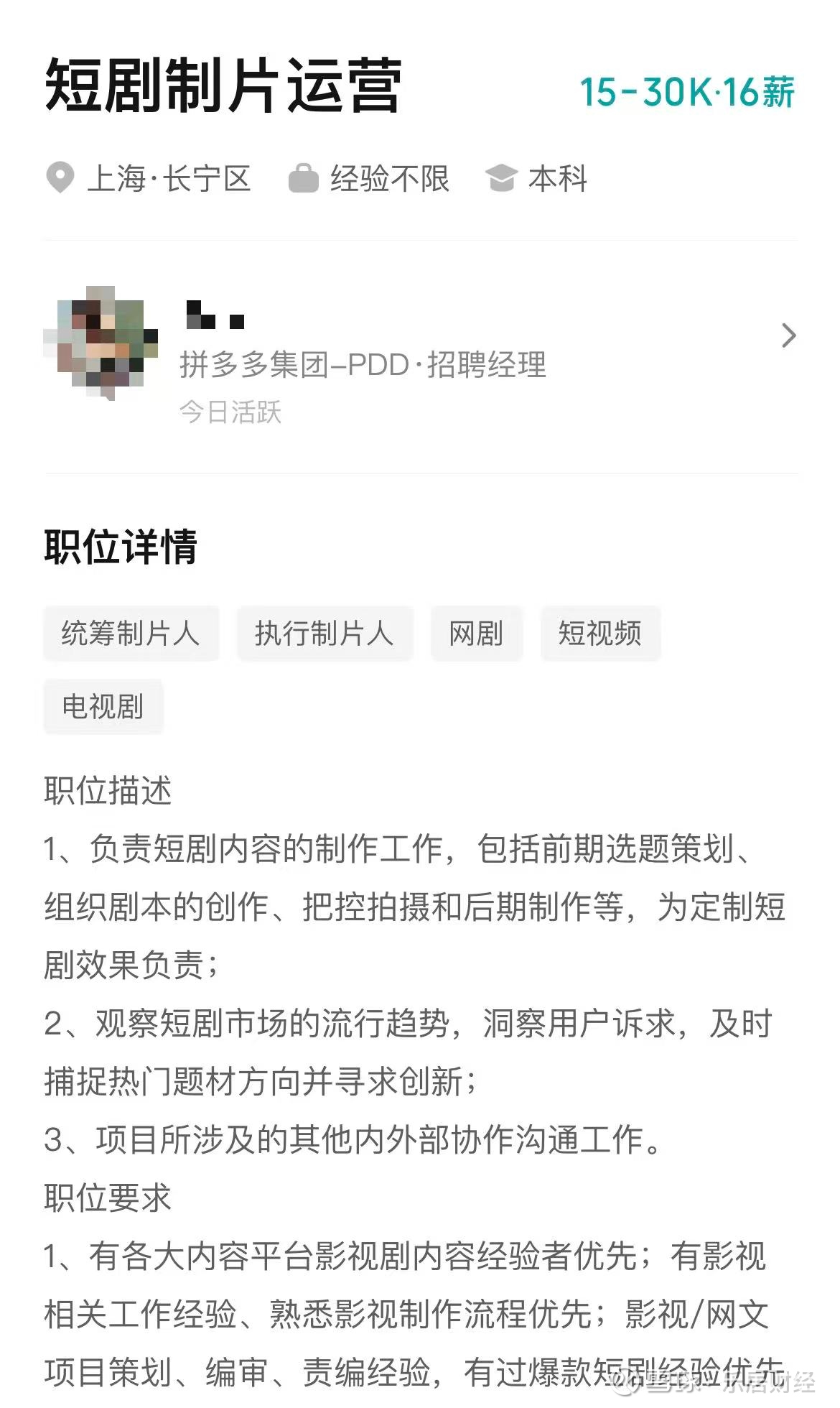 业内人士指出,通过上述招聘信息,可以确定拼多多要亲自下场做短剧,而且主攻定制剧了。
