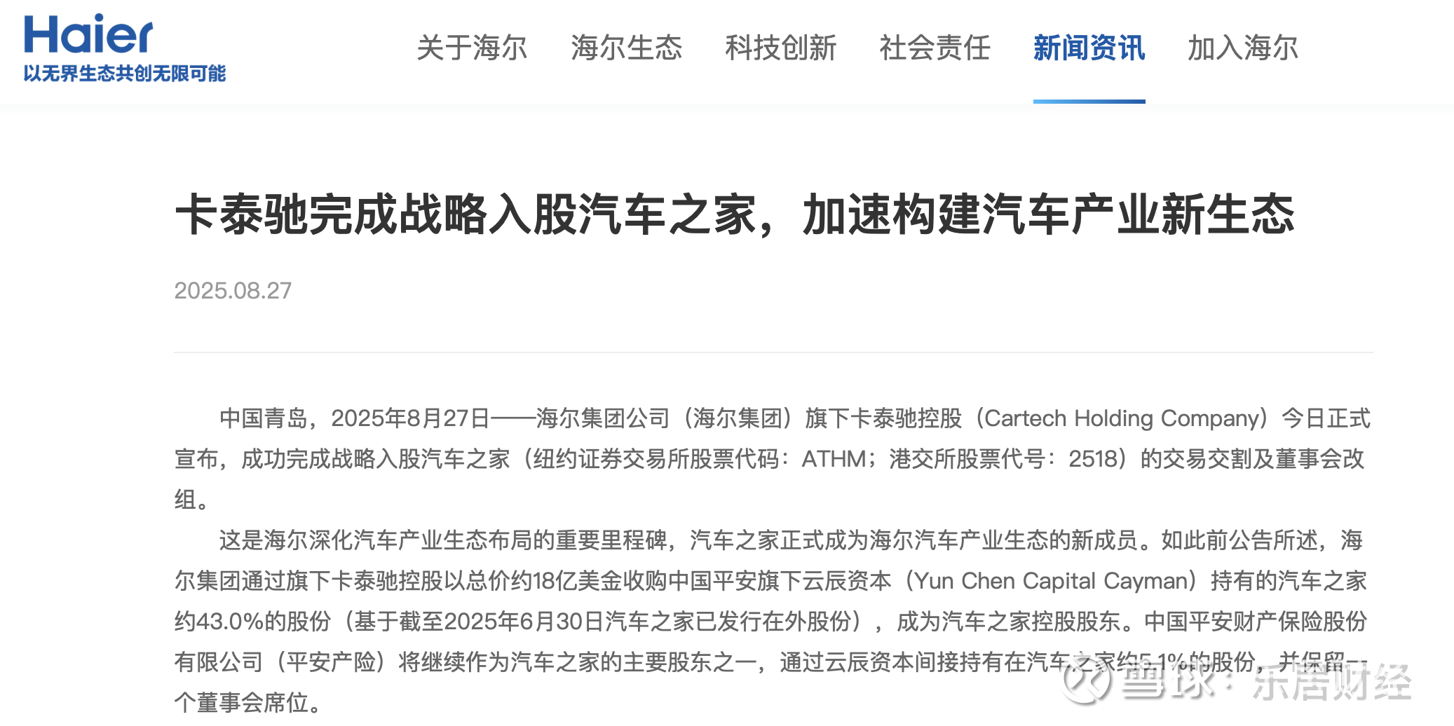 瑞财经 吴文婷 近日,海尔集团旗下卡泰驰控股正式宣布,成功完成战略入股汽车之家的交易交割及董事会改组。
