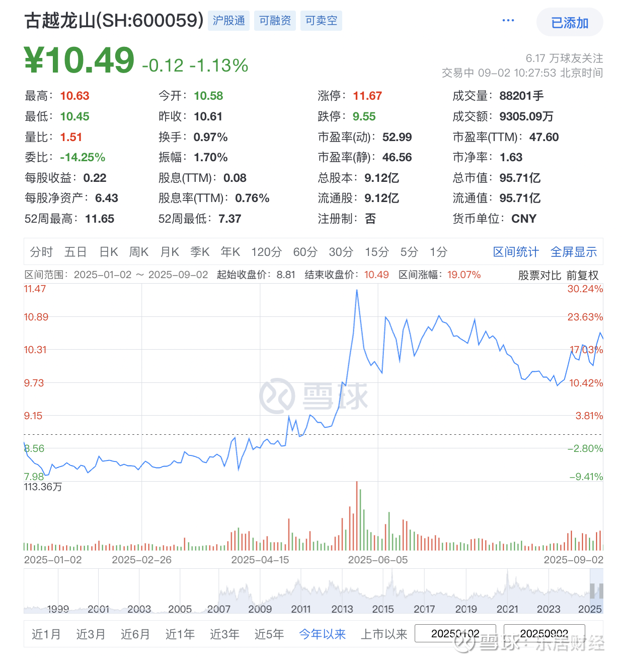 2025年上半年,古越龙山实现营业收入8.93亿元,比上年同期增加0.40%;归属于上市公司股东的净利润9030.71万元,比上年同期减少4.72%;归属于上市公司股东的扣除非经常性损益的净利润8097.86万元,比上年同期减少12.13%。