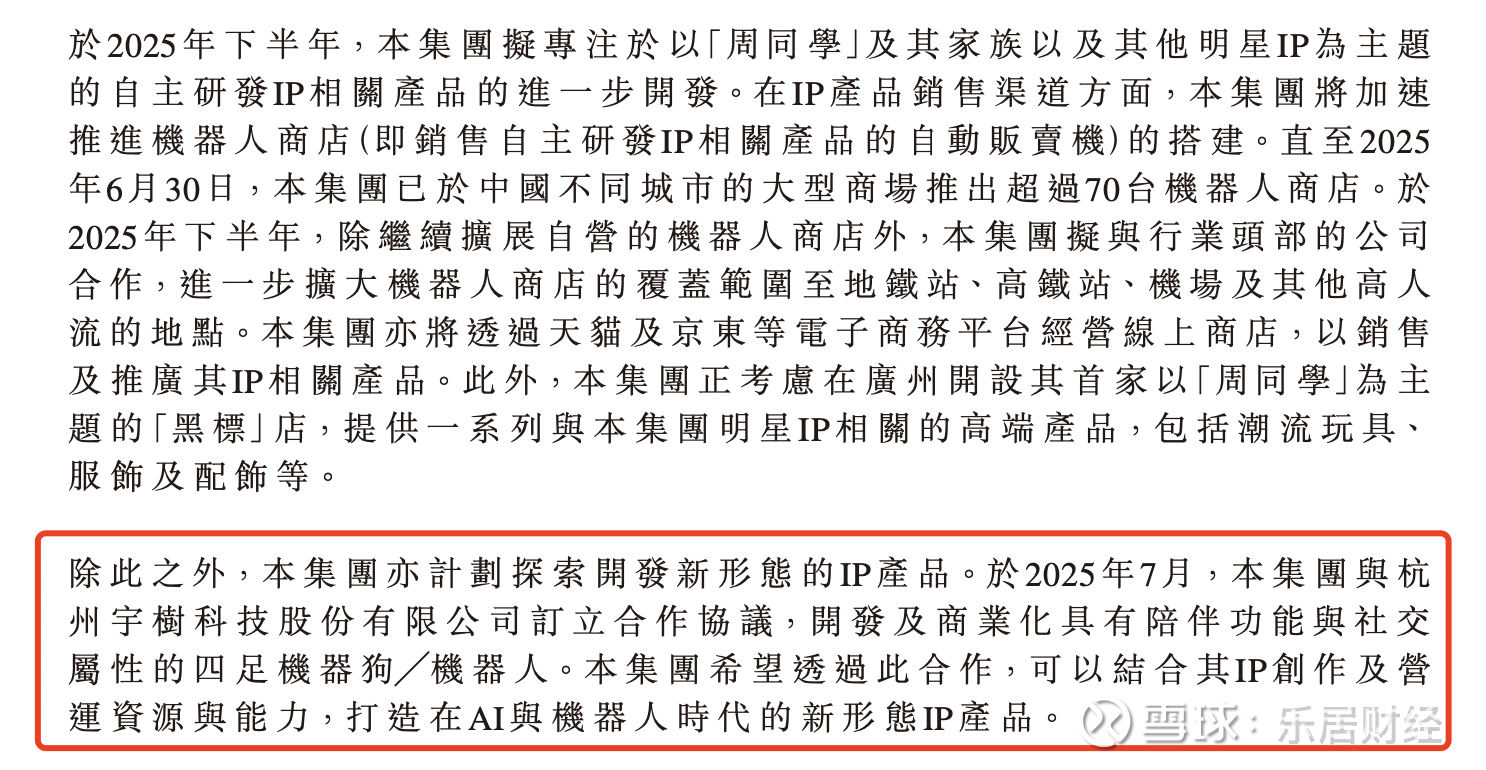 除此之外,集团亦计划探索开发新形态的IP产品。于2025年7月,集团与杭州宇树科技股份有限公司订立合作协议,开发及商业化具有陪伴功能与社交属性的四足机器狗/机器人。集团希望透过此合作,可以结合其IP创作及营运资源与能力,打造在AI与机器人时代的新形态IP产品。