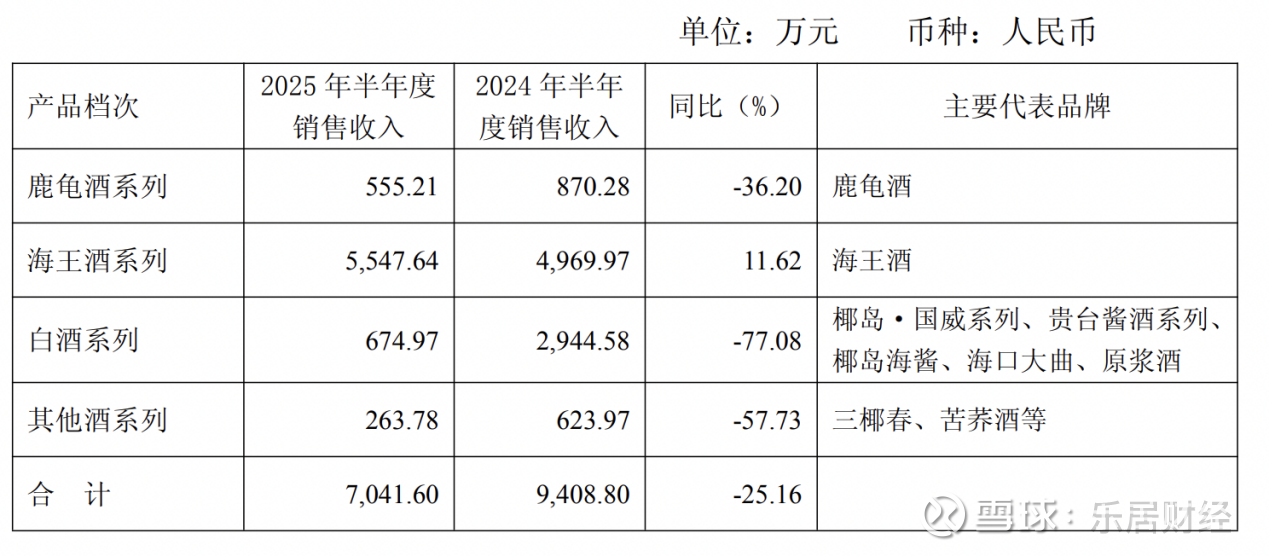 分产品来看,2025年上半年,*ST椰岛酒类收入7041.6万元,同比下降25.16%。具体来看:鹿龟酒系列、白酒系列、其他酒系列收入分别为555.21万元、674.97万元、263.78万元,分别同比下滑36.20%、77.08%、57.73%;海王酒系列 5547.64万元,同比增长11.62%。