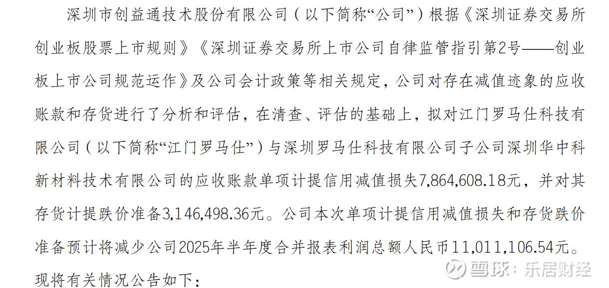 此前,另一A股上市公司创益通(SZ300991)公告称,拟对拟对江门罗马仕与深圳罗马仕科技有限公司子公司深圳华中科新材料技术有限公司的应收账款单项计提信用减值损失786.46万元,并对其存货计提跌价准备314.65万元。公司本次单项计提信用减值损失和存货跌价准备预计将减少公司2025年半年度合并报表利润总额1101.11万元。据了解。2025年上半年,创益通归母净亏损81.42万元,这意味着若无上述影响,创益通或仍处于盈利状态。