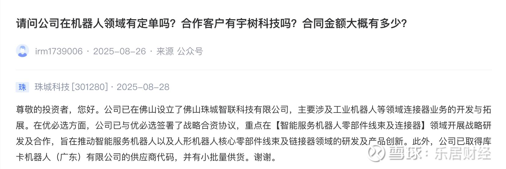 近日,珠城科技在互动平台表示,公司已与优必选签署了战略合资协议,重点在智能服务机器人零部件线束及连接器领域开展战略研发及合作,旨在推动智能服务机器人以及人形机器人核心零部件线束及链接器领域的研发及产品创新。