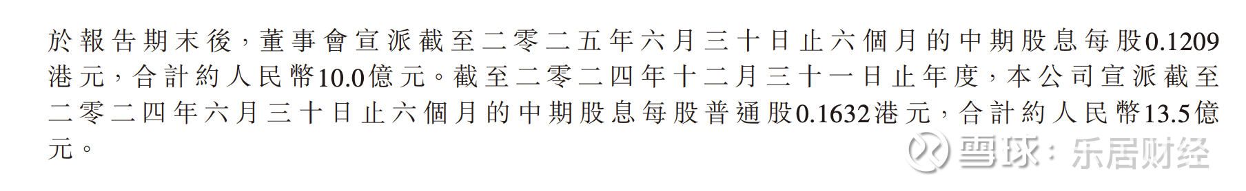 同时,中国飞鹤宣布,2025年上半年中期股息每股0.1209港元,合计约10.0亿元。