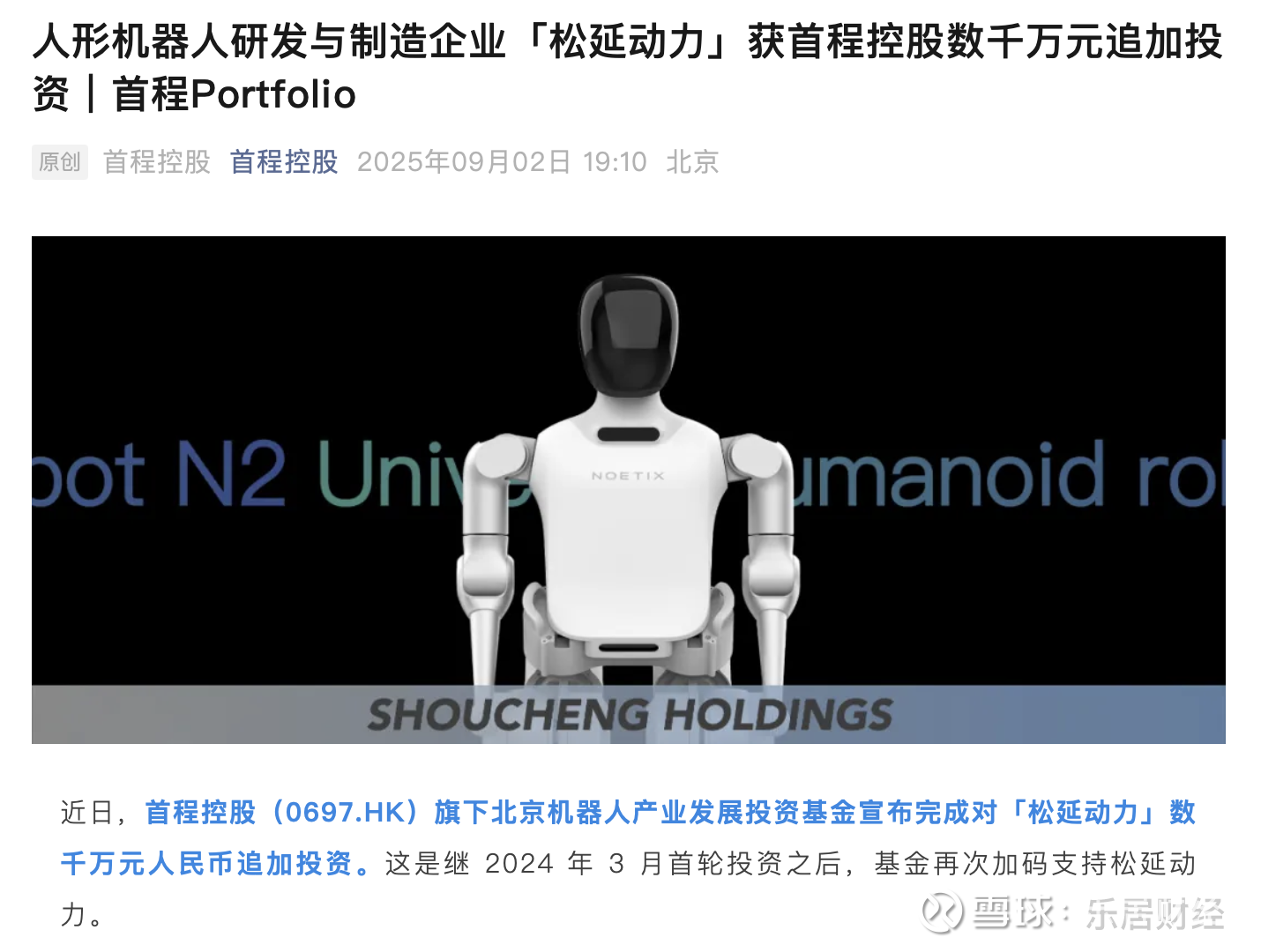 瑞财经 吴文婷 近日,首程控股(0697.HK)旗下北京机器人产业发展投资基金宣布完成对人形机器人企业“松延动力”数千万元追加投资。这是继2024年3月首轮投资之后,基金再次加码支持松延动力。