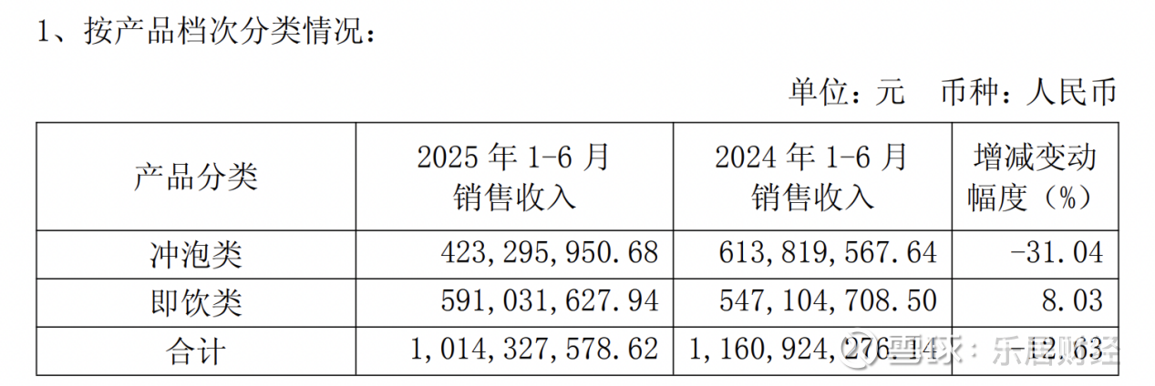 从业务板块来看,作为传统支柱的冲泡业务,上半年收入为4.23亿元,同比减少31.04%。而即饮业务实现营收5.91亿元,同比增长8.03%,营收占比首次超越冲泡业务,达到58.27%。