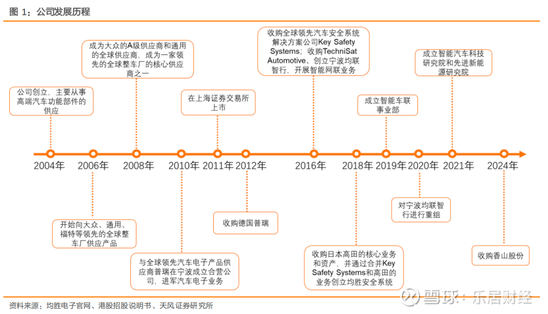 均胜电子前身为辽源得亨,历史可追溯至均胜集团于2004年创立的汽车零部件业务。