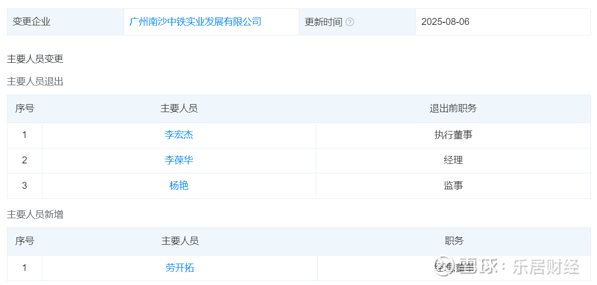 天眼查显示,今年8月,广州南沙中铁实业发展有限公司发生高管变动,执行董事李宏杰、经理李葆华、监事杨艳退出,新增劳开拓担任经理、董事。