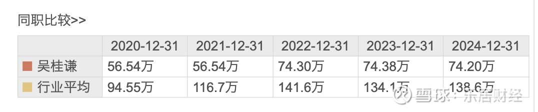 东方财富数据显示,2020年至2024年,吴桂谦薪酬分别为56.54万元、56.54万元、74.30万元、74.38万元、74.20万元。
