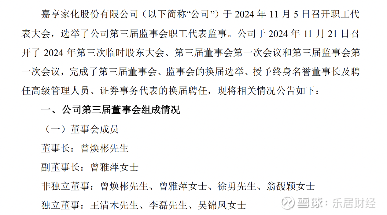 2024年11月21日,嘉亨家化创始人曾本生获授终身名誉董事长的称号,并卸任公司董事长、法定代表人职务,而这两个职位均由其子曾焕彬接任。此外,曾本生之女曾雅萍首次进入董事会名单中,担任公司副总经理、副董事长