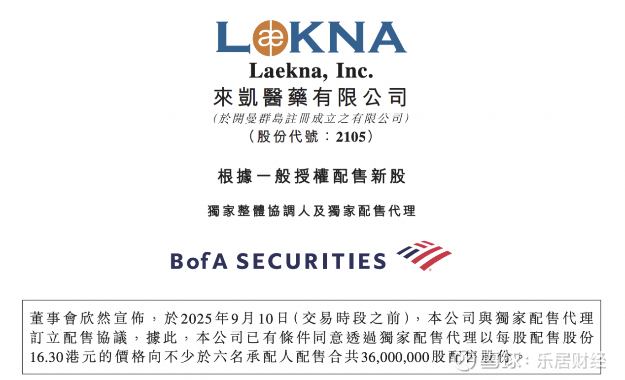 瑞财经 刘治颖9月10日,来凯医药-B(02105)公告,公司拟配售3600万股,占扩大后股本约8.1%,每股作价16.3港元,较9月9日收市价18.01港元折让约9.5%。