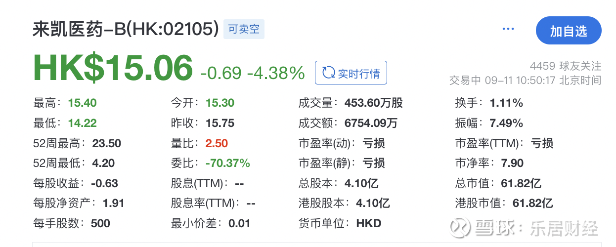来凯医药于2023年6月29日登陆港交所。截至发稿,来凯医药跌4.38%,报15.06港元/股,总市值为61.82亿港元。