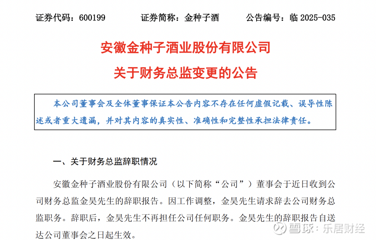 瑞财经 刘治颖9月10日,金种子酒(SH600199)公告,因工作调整,金昊请求辞去公司财务总监职务。辞职后,金昊不再担任公司任何职务。金昊原定任期到期日为2025年11月21日。