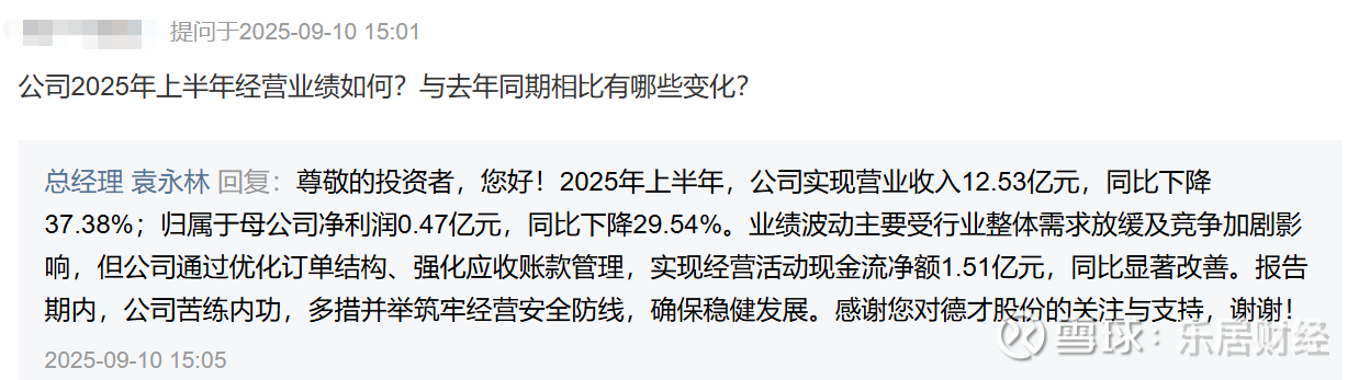 乐居财经 李兰 9月10日,德才股份召开2025年半年度业绩说明会,总经理袁永林、独立董事郑伟、董事会秘书王文静、财务负责人杨翠芬出席会议。