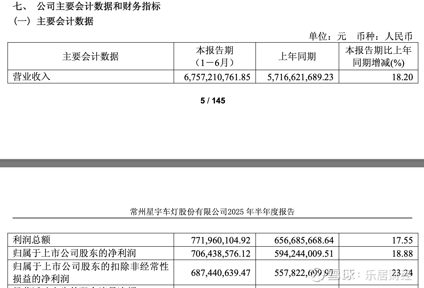 据星宇股份(601799.SH)最新发布的2025年半年报显示,今年上半年实现营业收入约67.57亿元,同比增长18.2%;实现归属于上市公司股东的净利润约7.06亿元,同比增长18.88%;实现归属于上市公司股东的扣非净利润约6.87亿元,同比增长23.24%。
